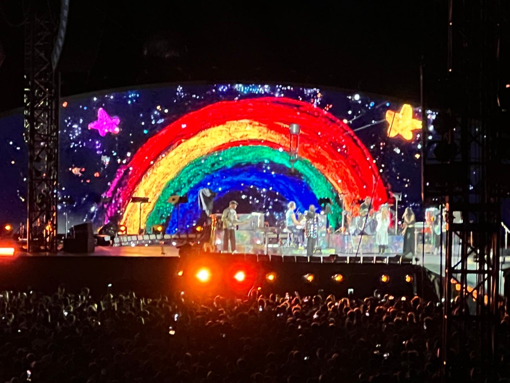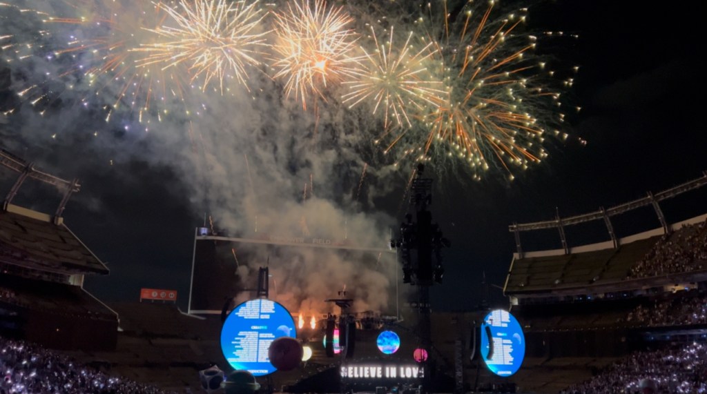 So it was fitting at concert’s end when Chris Martin’s final words and the band’s final message – BELIEVE IN LOVE – appeared as fireworks illuminated the night sky and the names of every crew member (movie credits-style) scrolled up on the two moon-shaped screens.