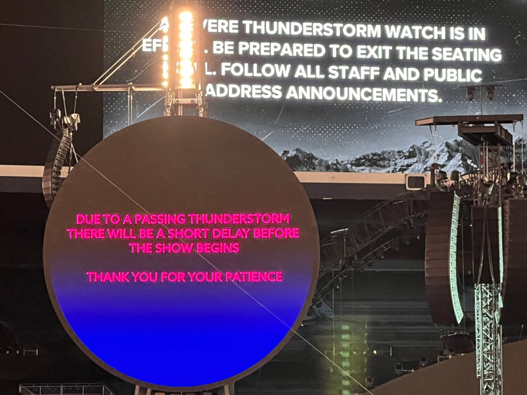 As the minutes ticked by, I worried that the concert might be cancelled. Many people started leaving their seats to head inside the concourse. Finally, a message flashed on the screens that the show would begin soon after a brief delay due to a passing thunderstorm.