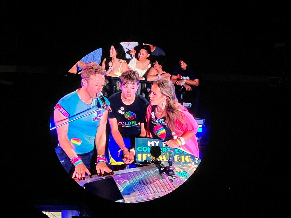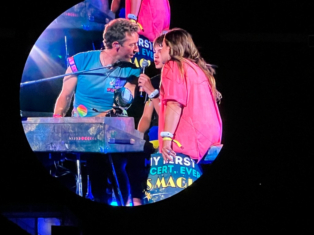 A teenager held up a sign that read, “MY FIRST CONCERT, EVER. IT’S MAGIC.” Chris Martin asked, “Really?” and invited him and his companion up on stage to join him in singing “Magic.” (Asher and Allison, if I remember correctly.) The kid looked a bit shell-shocked, prompting Chris Martin to saying something to the effect of, “I’m just a regular human. It’s all good, mate.” to help him relax.