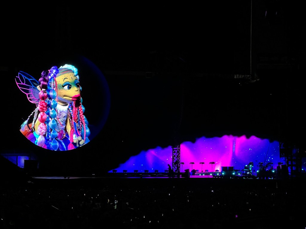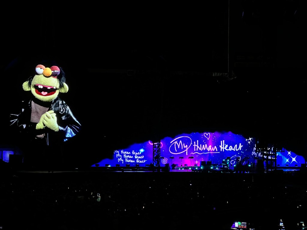 A few other noteworthy moments: the audience doing the wave several times around the stadium, large beach balls bouncing through the crowd, the “aliens,” the remote-controlled planets drifting lazily around the perimeter of the floor, our LED wrist bands flashing in sync and changing colors throughout the stadium (except The Claw’s, which was a minor bummer…one defective light among 76,125 is pretty good), punk rock puppets (“The Weirdos”) singing “Human Heart,” and the fireworks that closed the show.