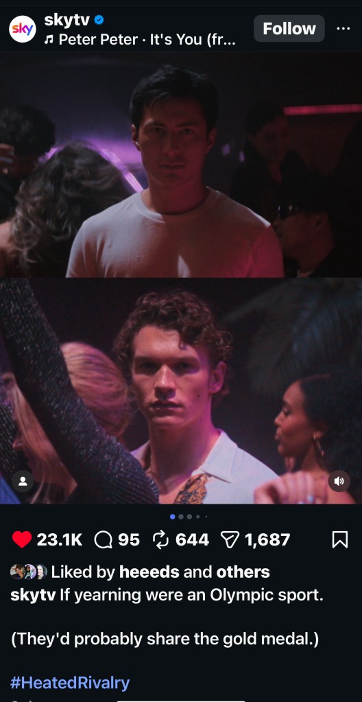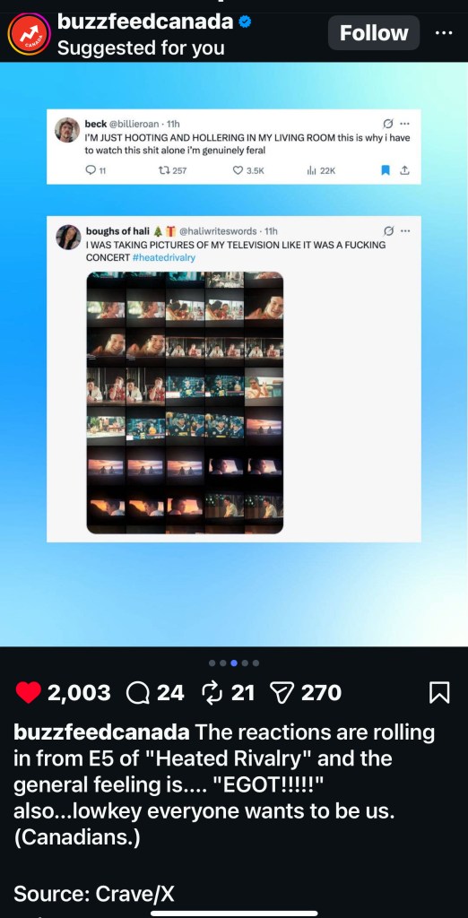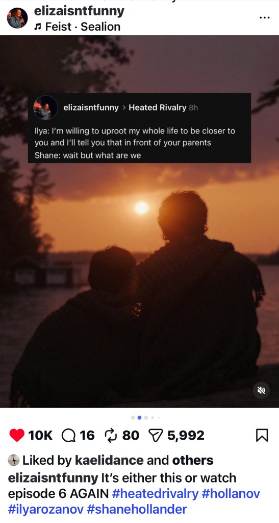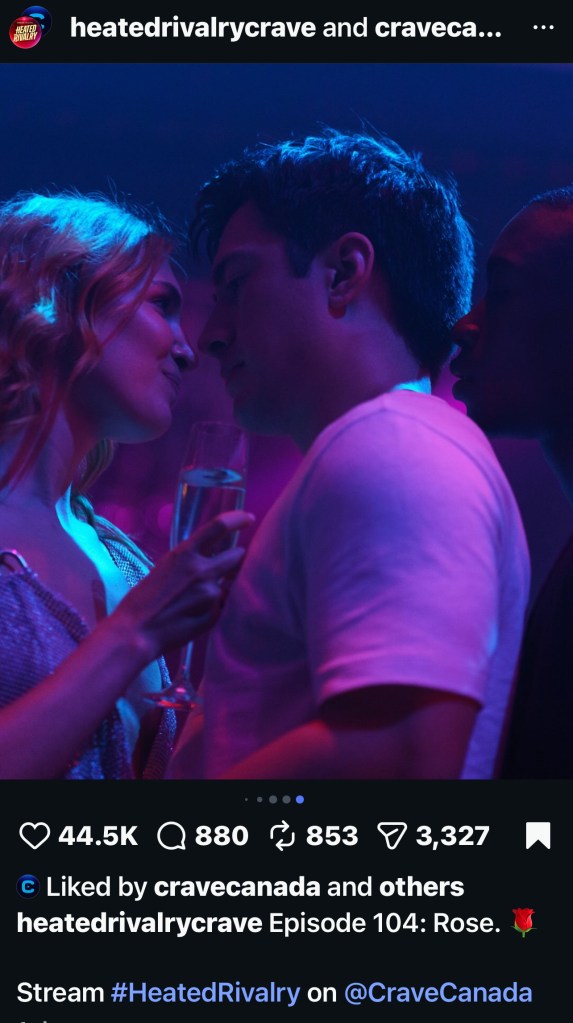 Not to mention listening to songs from the newly-released Heated Rivalry soundtrack by Peter Peter, including “It’s You (from Heated Rivalry).“