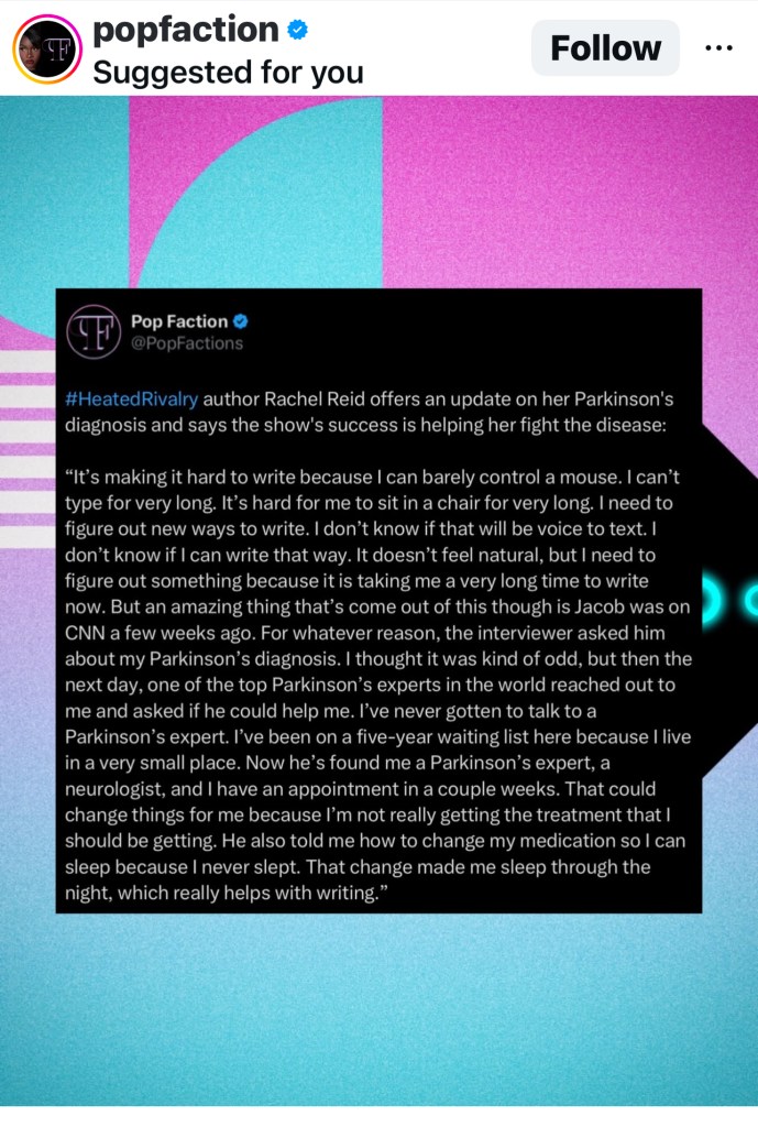 - Public relations led to medical care: Author Rachel Reid lives in Nova Scotia, far away from proper medical care for her Parkinson’s diagnosis that she’s been living with for years and that makes the physical act of writing challenging. After a CNN interview featuring Heated Rivalry writer-director Jacob Tierney, who mentioned Reid’s diagnosis, a Parkinson’s expert contacted Reid directly and coordinated Parkinson’s specialists to provide the care she needs.