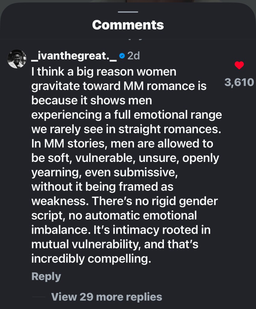 Another important theme and popular discussion topic: it’s OK for men to be vulnerable. One fan said it best in the post above about why women gravitate to “MM” romance.